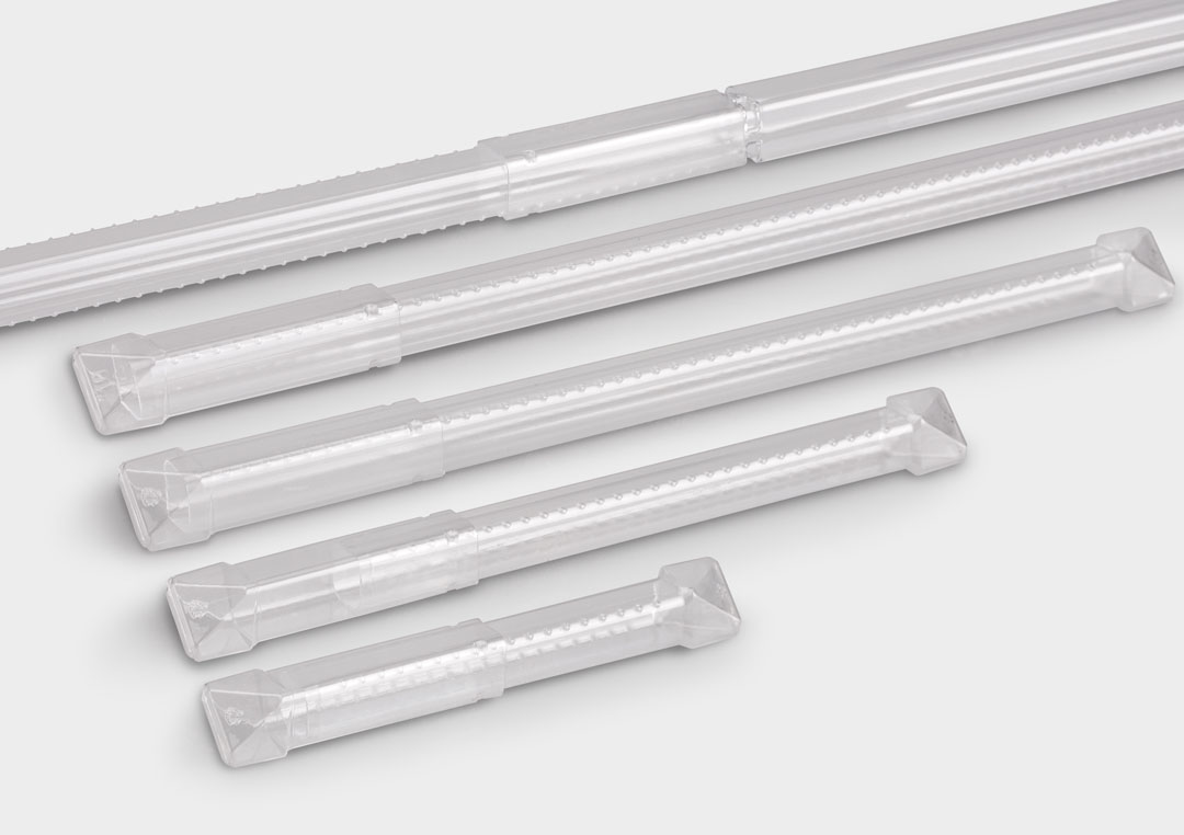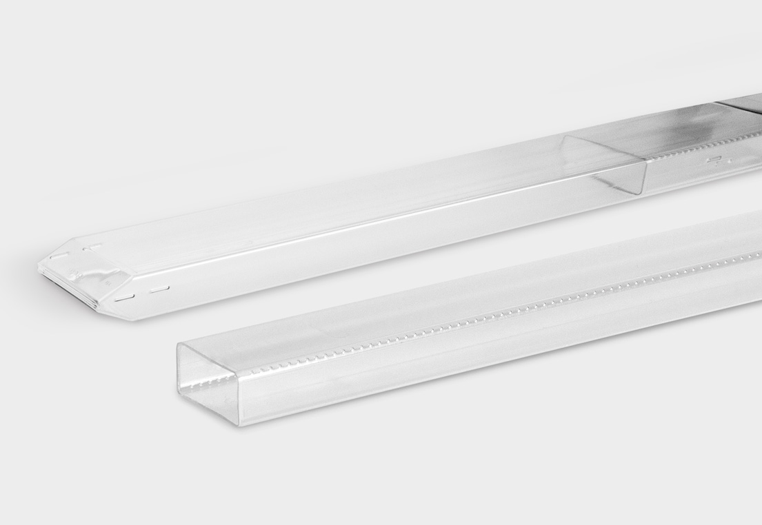 Our QuadroPack TipLine plastic tube provides optimal protection for long surgical instruments and other applications. The ends of this square tube taper to a point, reducing the risk of the contents piercing through the packaging. RectangularPack TipLine meets the same requirements. Both packaging tubes allow universal use thanks to versatile length adjustment and, for example, are ideal for transporting and storing rods, guide wires, and K-wires.