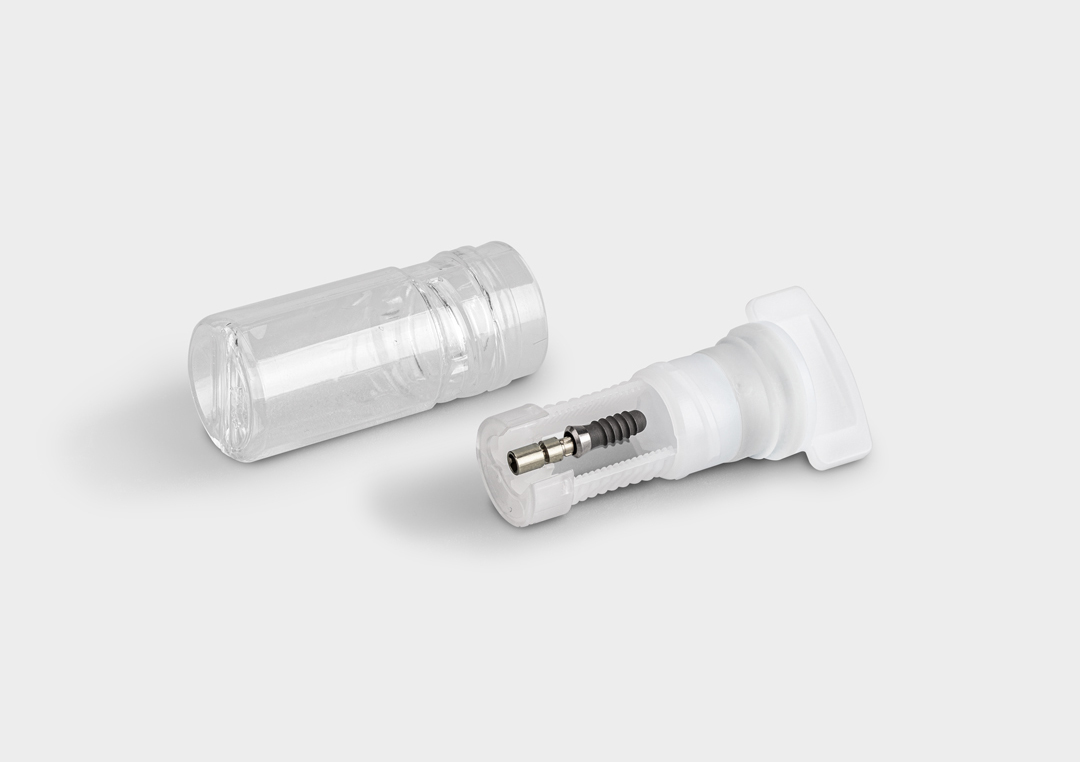 Download (573 KB, PDF)After opening the transparent protective tube, a 90-degree rotation of the cover on the implant holder allows direct access to the implant. The implant holder must be facing upwards to prevent the implant from falling out. After removal of the implant, the closure screw can be unlocked and also removed by rotating the cover 180 degrees.