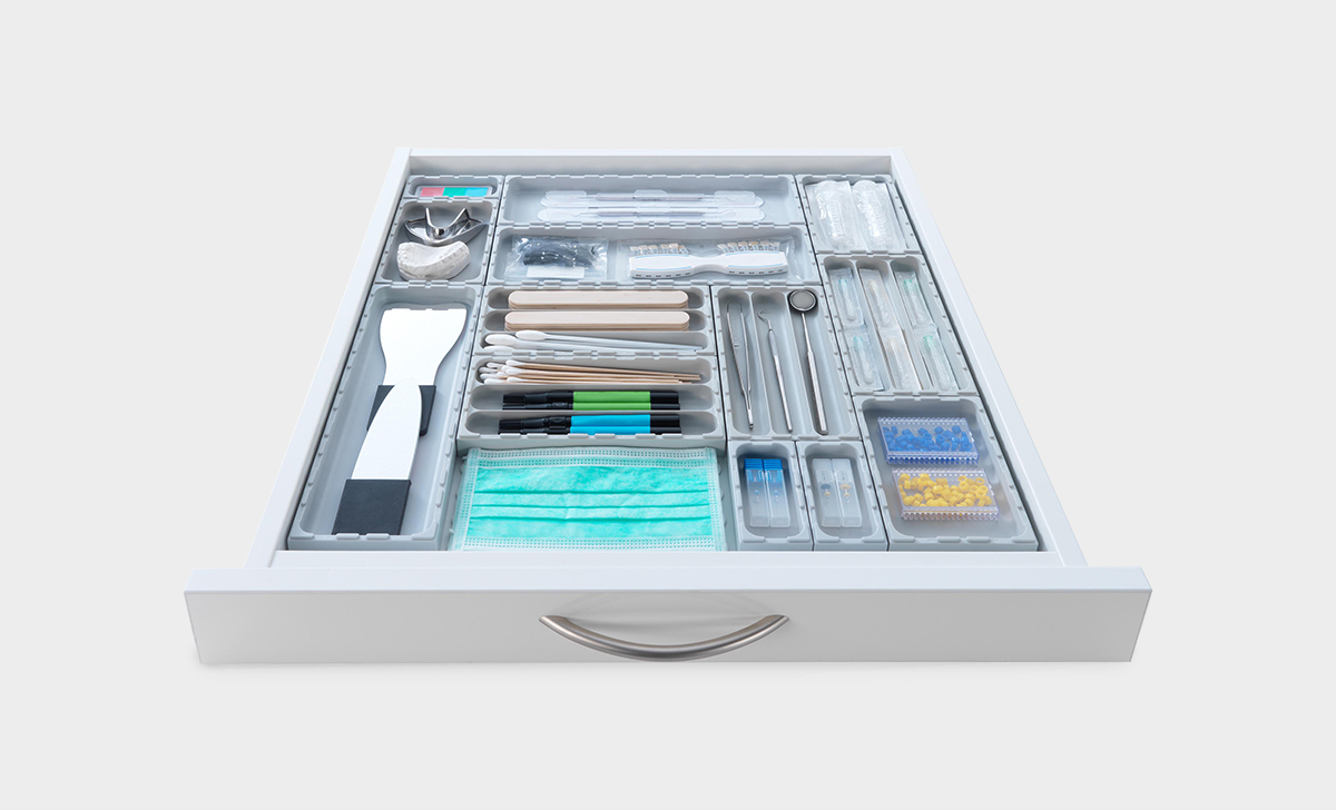 Introducing AQURADO® – our clever organizer. In no time at all you can finally put an end to the confusion in your drawer units – whether in the lab, the clinic or the office. You now have the perfect home for all your lab and office equipment, both large and small. Just imagine always being able to find the right dental mirror in the right size – at the first attempt!